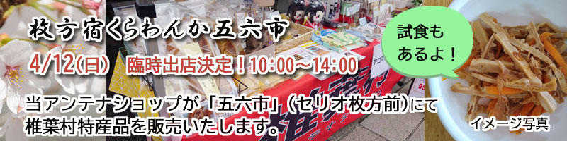 - 4/12ひらかた五六市臨時出店!干したけのこ&原木椎茸試食販売します!